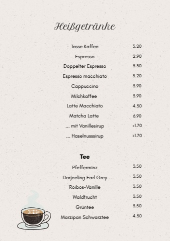 Tasse KaffeeEspressoDoppelter EspressoEspresso macchiatoCappuccinoMilchkaffeeLatte MacchiatoMatcha Latte... mit Vanillesirup... HaselnusssirupTeePfefferminzDarjeeling Earl GreyRoibos-VanilleWaldfruchtGr%u00fcnteeMarzipan SchwarzteeHei%u00dfgetr%u00e4nke3.202.905.303.203.903.904.506.90+1.70+1.703.503.503.503.503.504.50