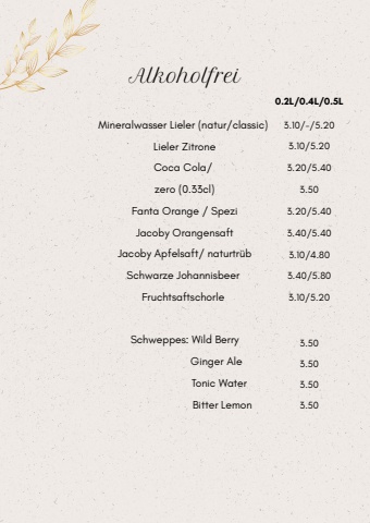 AlkoholfreiMineralwasser Lieler (natur/classic)Lieler ZitroneCoca Cola/zero (0.33cl)Fanta Orange / SpeziJacoby OrangensaftJacoby Apfelsaft/ naturtr%u00fcbSchwarze JohannisbeerFruchtsaftschorleSchweppes: Wild BerryGinger AleTonic WaterBitter Lemon0.2L/0.4L/0.5L3.10/-/5.203.10/5.203.20/5.403.503.20/5.403.40/5.403.10/4.803.40/5.803.10/5.203.503.503.503.50