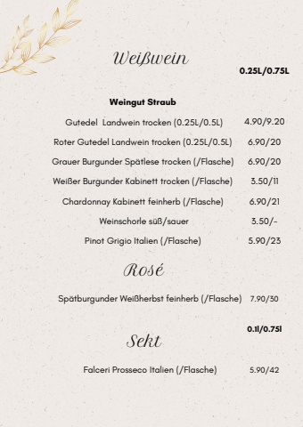 Wei%u00dfweinWeingut StraubGutedel Landwein trocken (0.25L/0.5L)Roter Gutedel Landwein trocken (0.25L/0.5L)Grauer Burgunder Sp%u00e4tlese trocken (/Flasche)Wei%u00dfer Burgunder Kabinett trocken (/Flasche)Chardonnay Kabinett feinherb (/Flasche)Weinschorle s%u00fc%u00df/sauerPinot Grigio Italien (/Flasche)0.25L/0.75L4.90/9.206.90/206.90/203.50/116.90/213.50/-5.90/23Ros%u00e9SektSp%u00e4tburgunder Wei%u00dfherbst feinherb (/Flasche) 7.90/30Falceri Prosseco Italien (/Flasche) 5.90/420.1l/0.75l